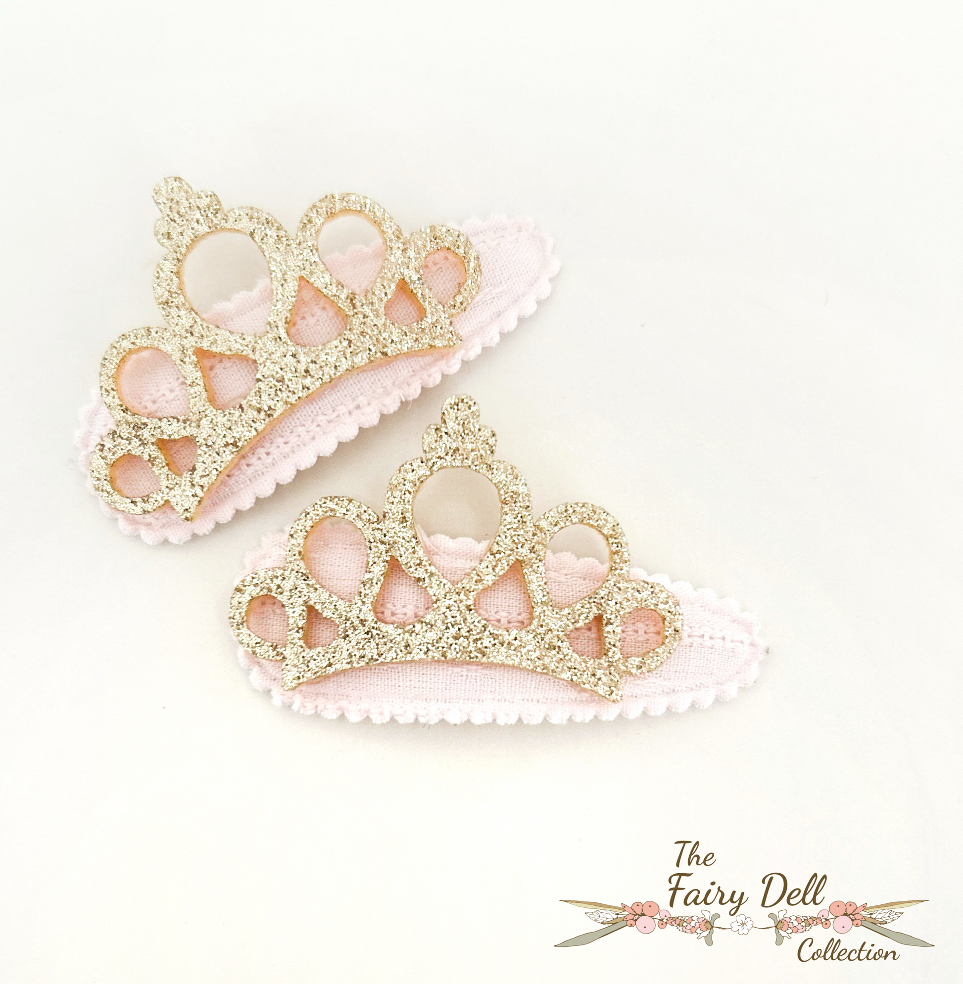 Aurelia is a set of 2 x pink large fabric snap clips topped with a stunning crown detail.