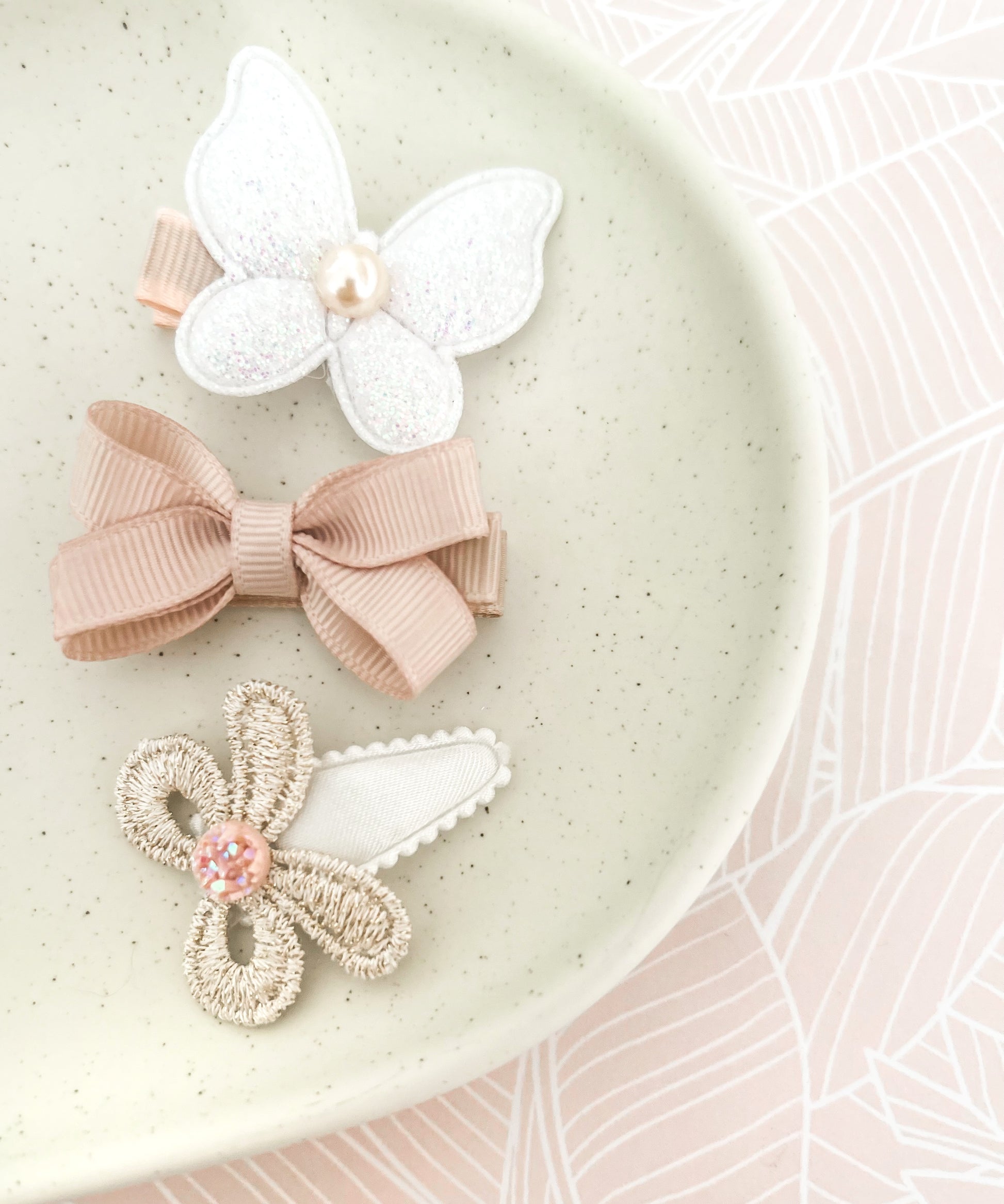 A gorgeous trio of nonslip hair clips, In soft champagne, blush & ivory tones.