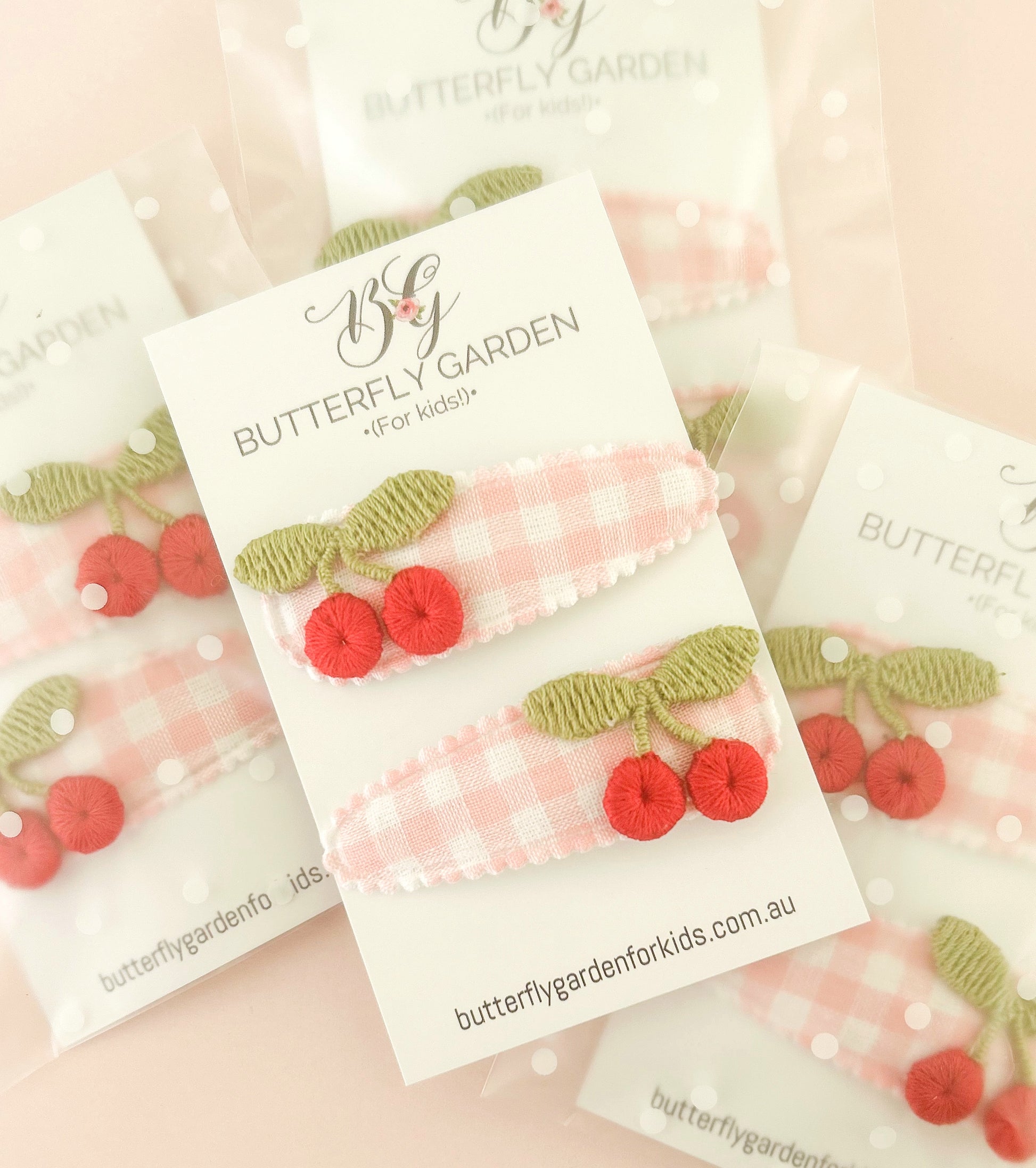 2 x beautiful fabric snap hair clips with sweet Cherry detail, perfect for taming wispy bits, fringes & soft curls- or just for a little pop of colour!