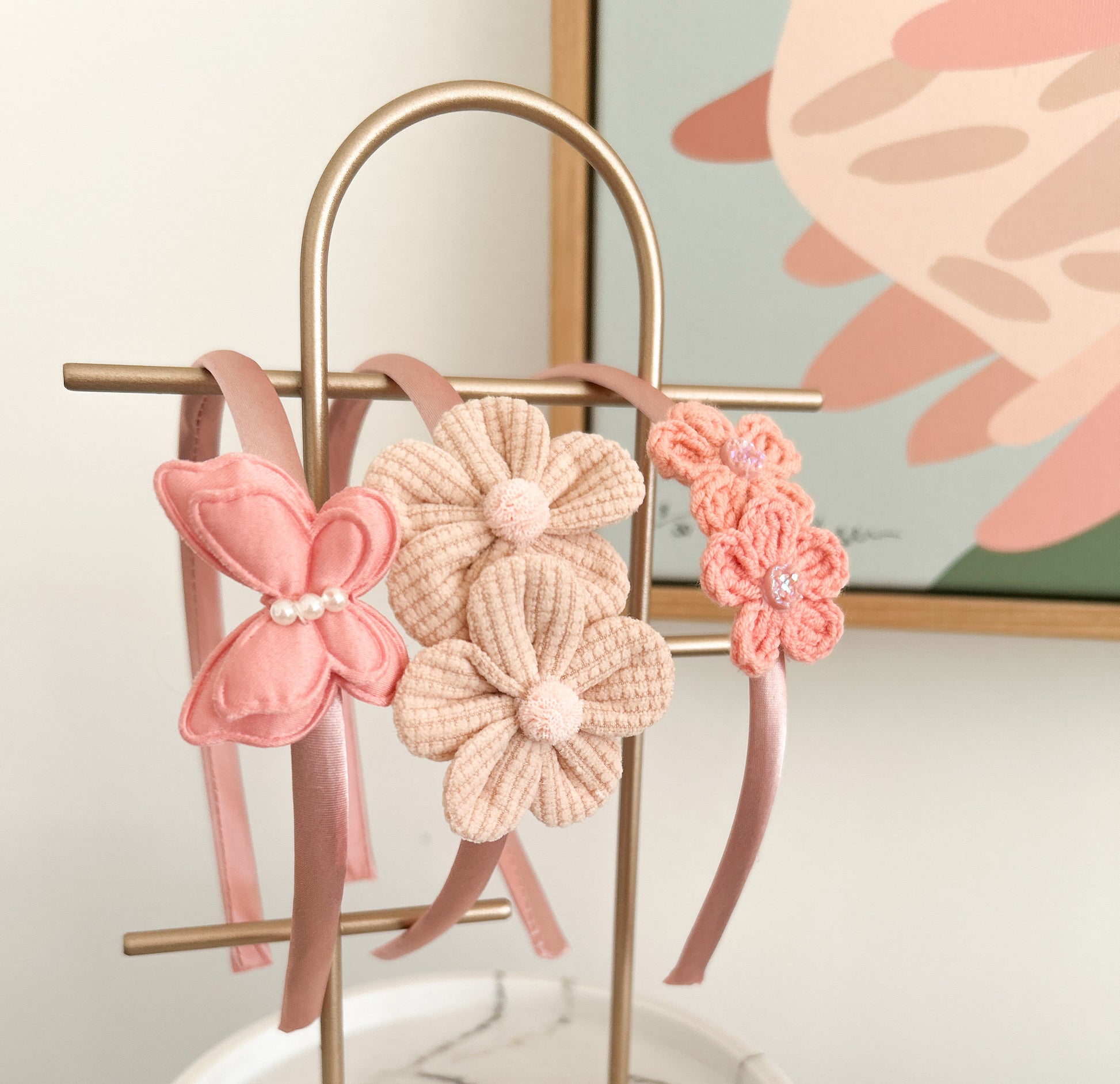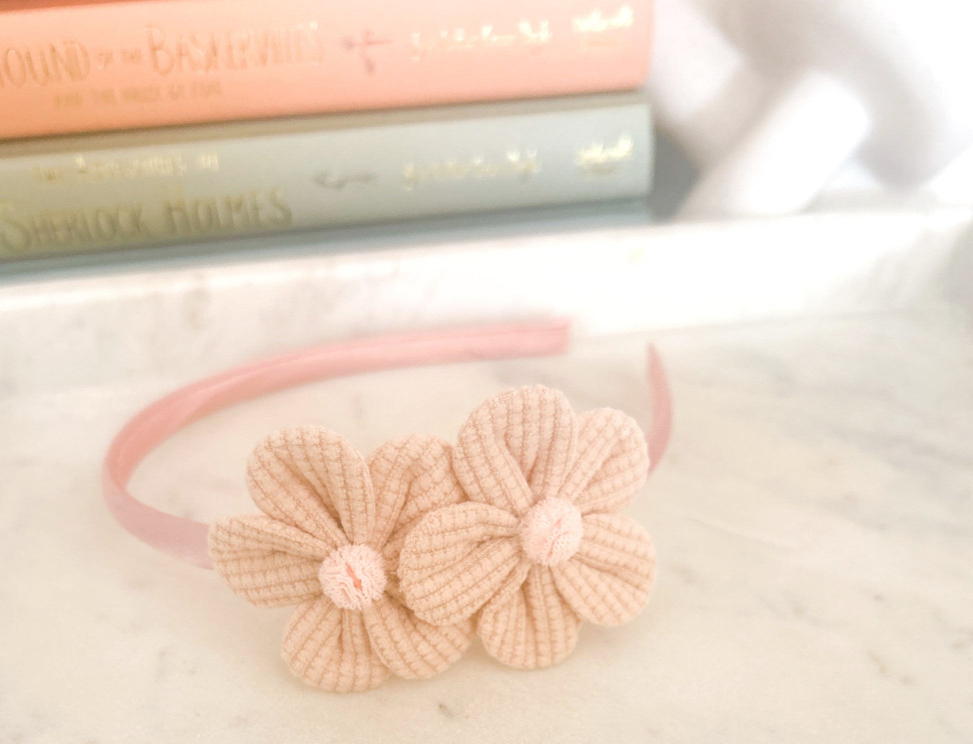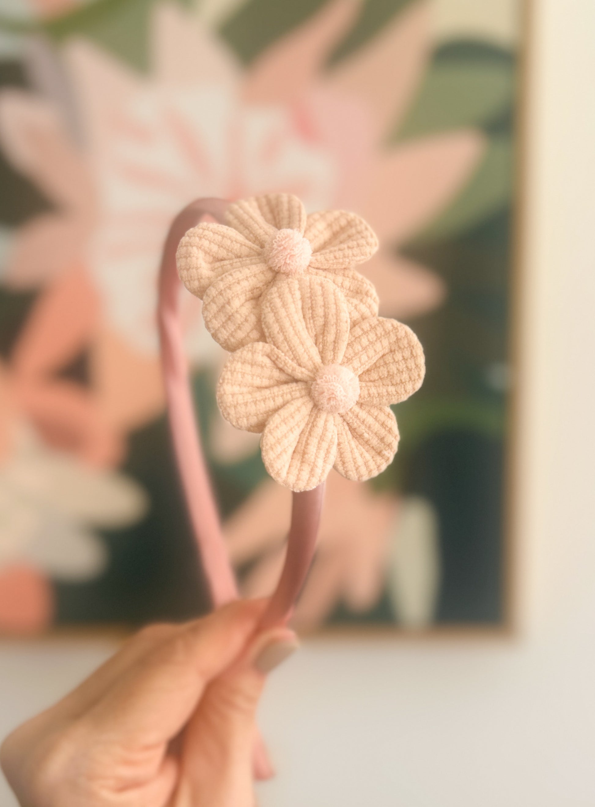 A pretty satin lined solid headband topped with 2 x blush blooms with pompom centres.