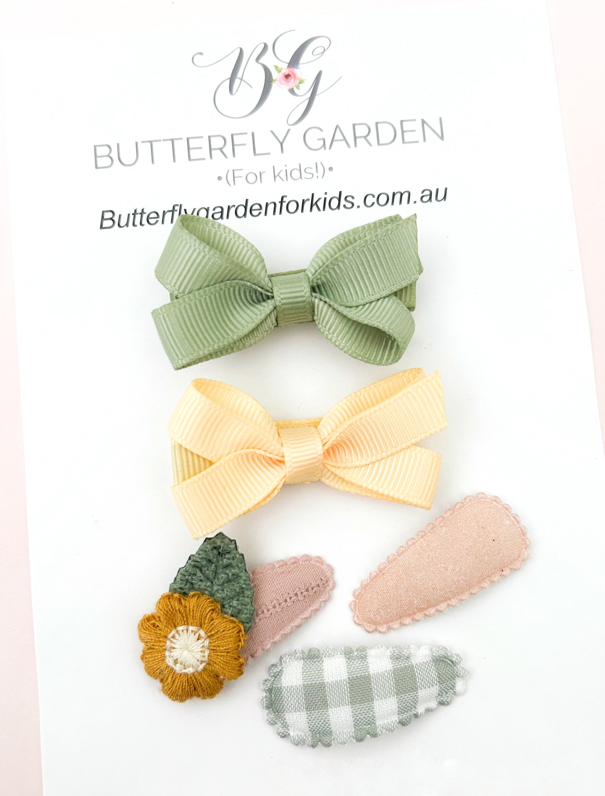 A beautiful set of mixed baby nonslip clips & Mini Grace bow in a soft Citrus tones - perfect as a newborn gift set, first birthday present or just a great way to sample some of our favourite clips!