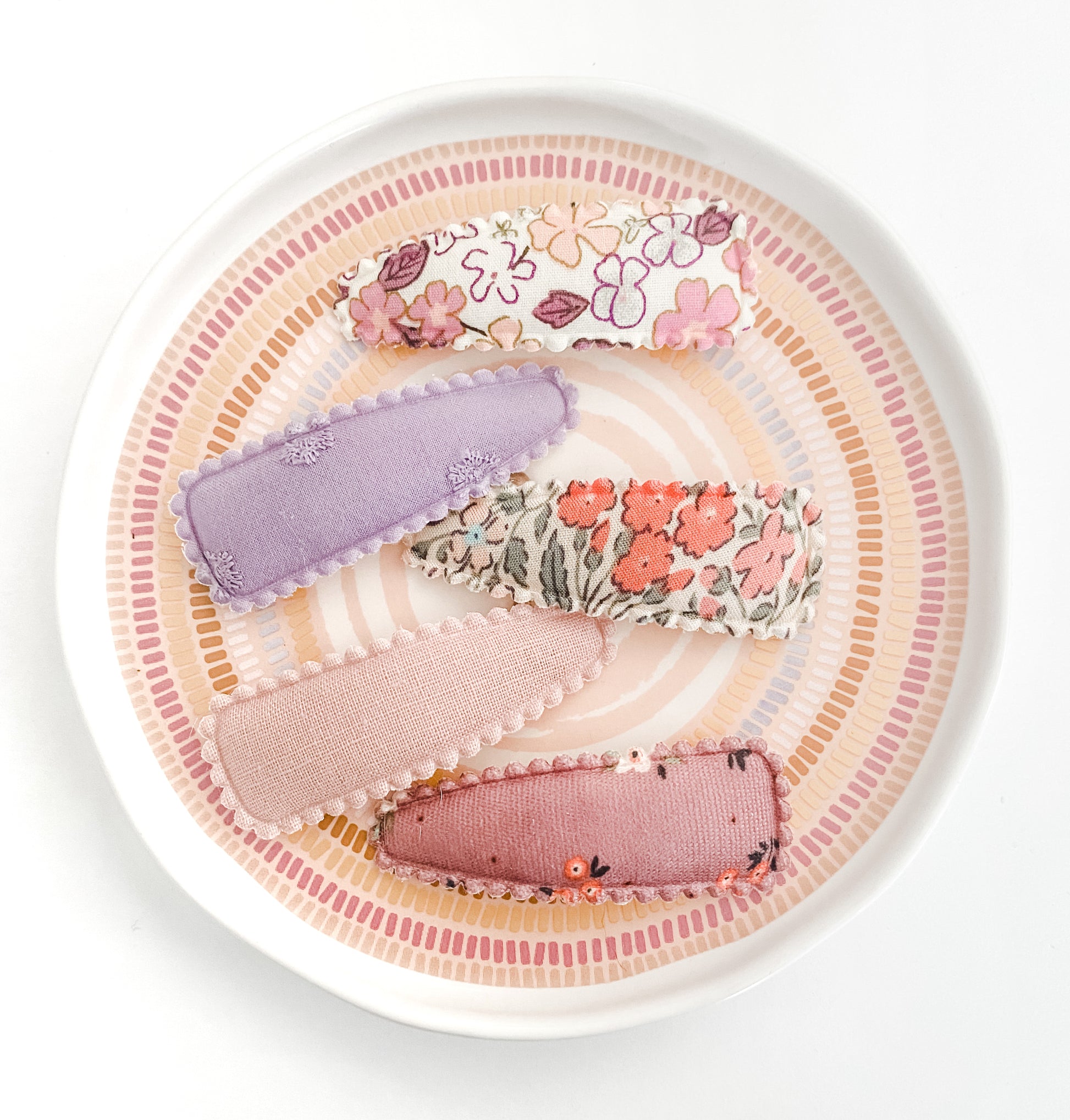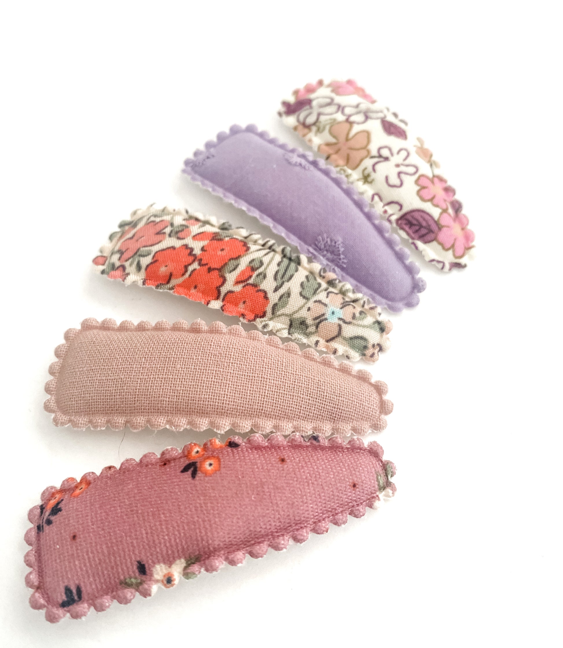 5 x beautiful fabric snap hair clips, perfect for taming wispy bits, fringes & soft curls- or just for a little pop of colour!