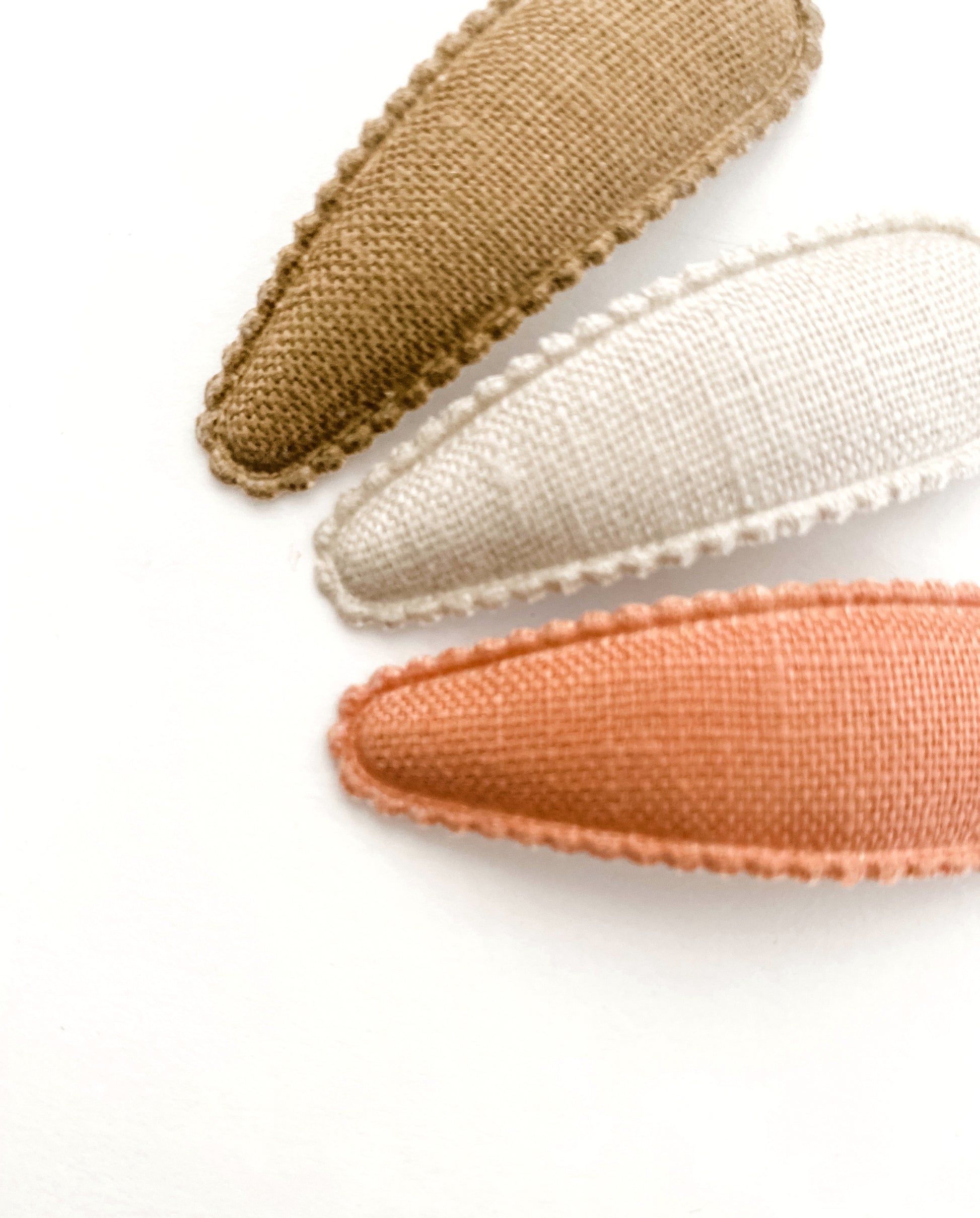 Oh the lush neutral tones! This gorgeous set of 3 x fabric linen snap hair clips is perfect for everyday & special occasions. Wear them individually or as a cluster for a few sweet pops of colour.