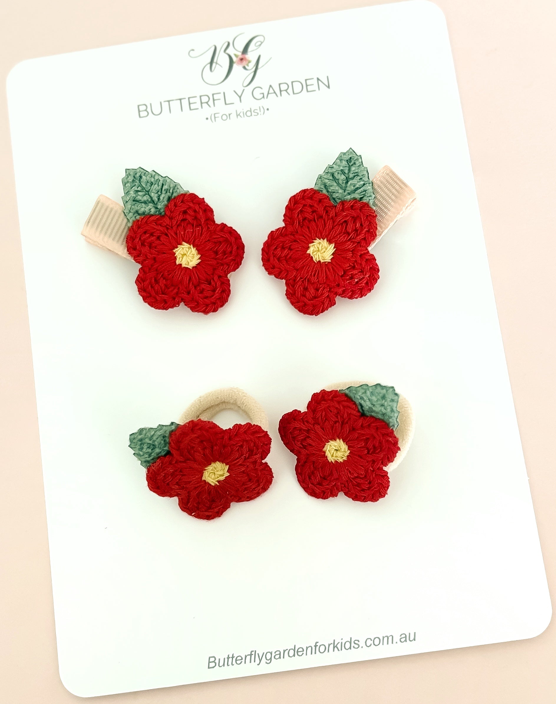 2 Beautiful crochet blooms with soft velvet leaves made on either our Petite hair ties or nonslip clips - perfect for soft baby locks, gentle on fine hair and designed to stay in.