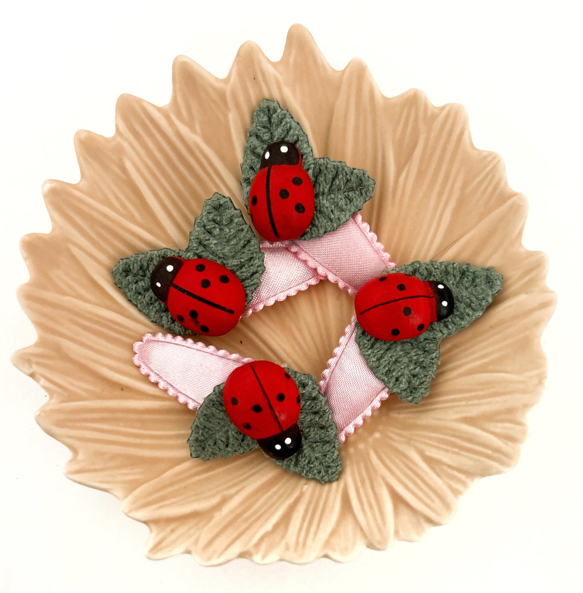 A lush velvet green leaf with the sweetest ladybird sitting atop a soft pink nonslip clip.