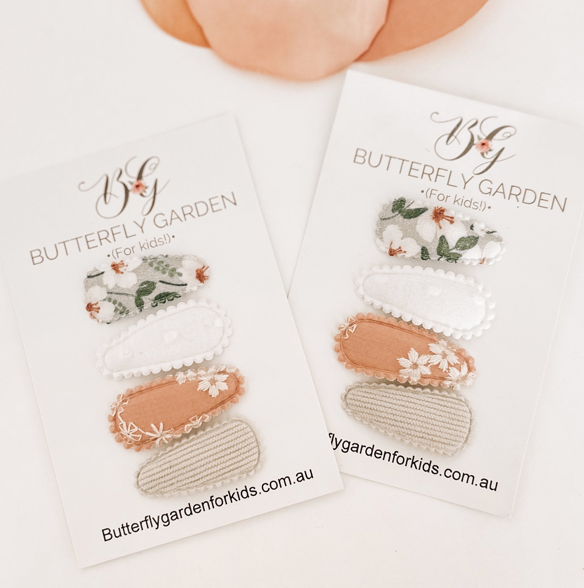 4 x gorgeous baby nonslip hair clips from our new Mini Cotton Snaps collection - mini versions of our popular larger Fabric Snap Clips, in limited edition prints & neutrals.