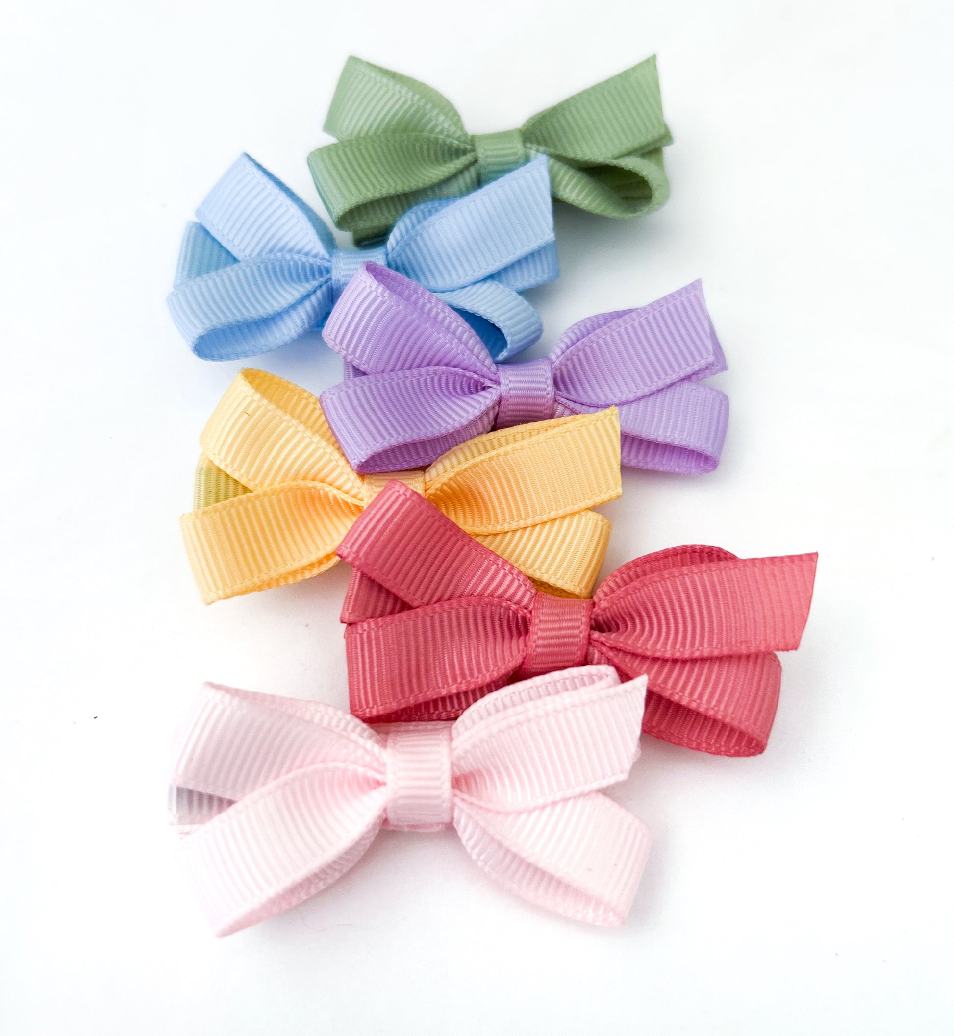 A petite hand tied bow on a matching 4cm nonslip clip in a gorgeous rainbow of pastel colours.