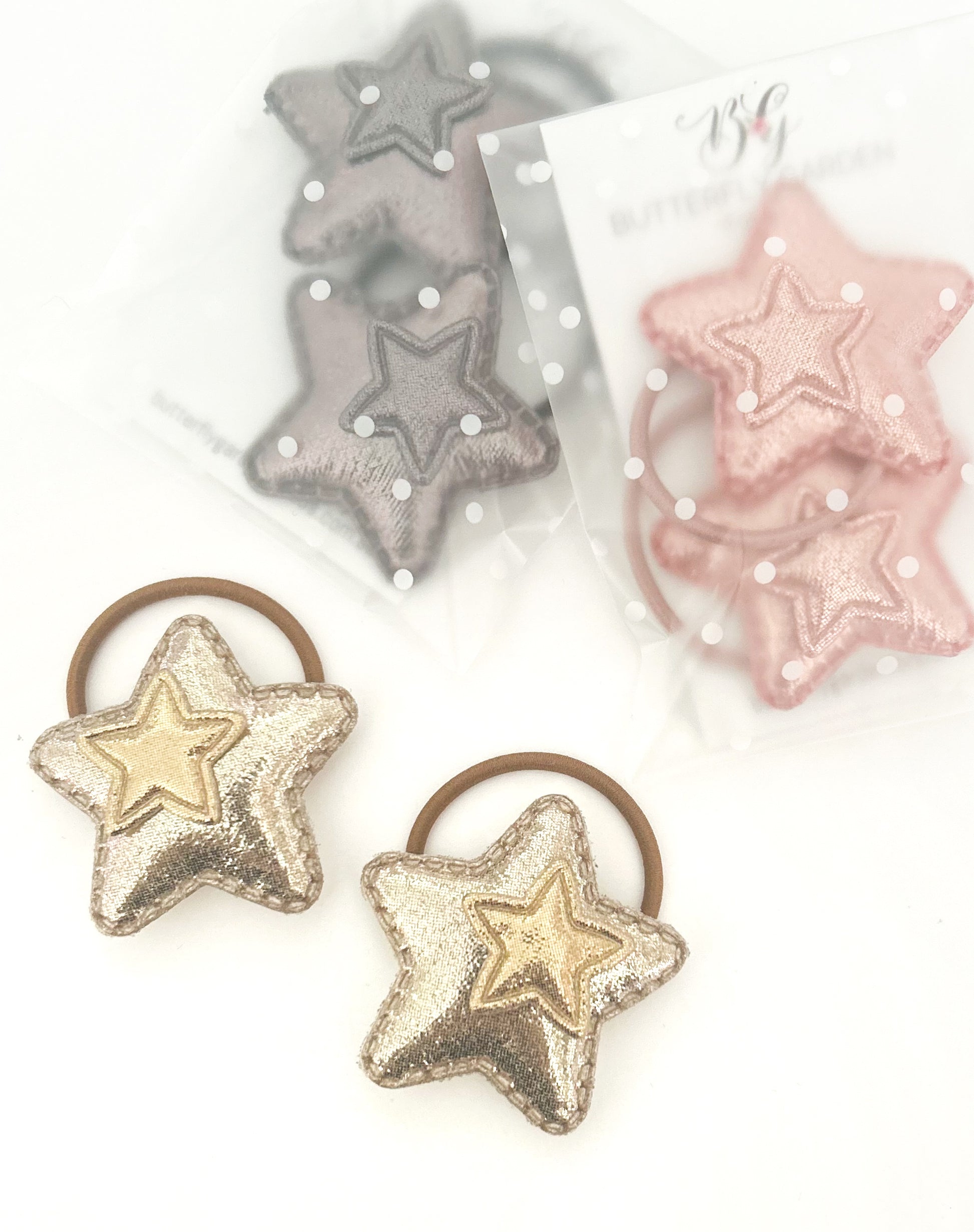 A Pair of stunning metallic stars with layered glitter centres made on medium no-snag hair ties - perfect for ponytails & pigtails!