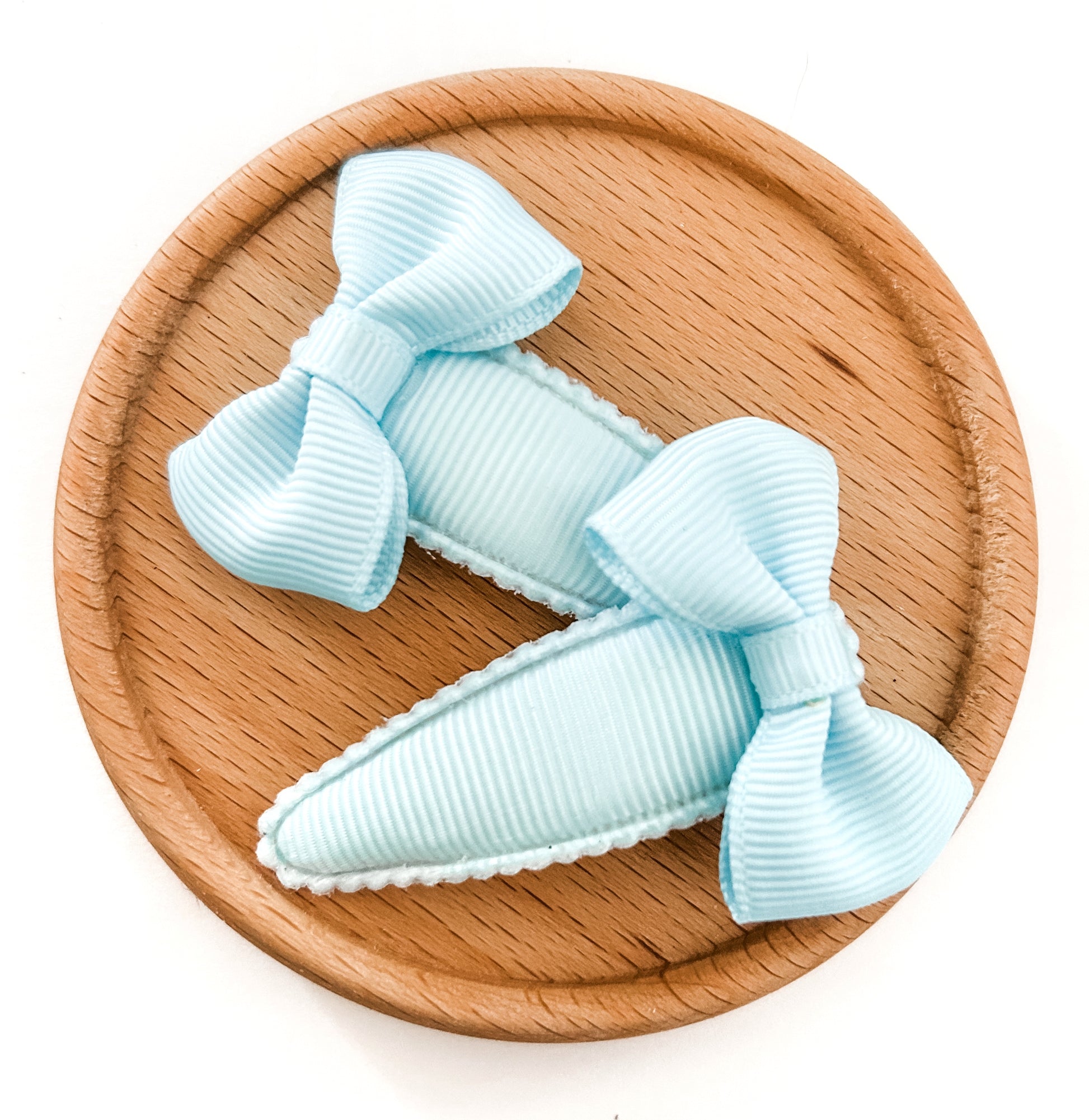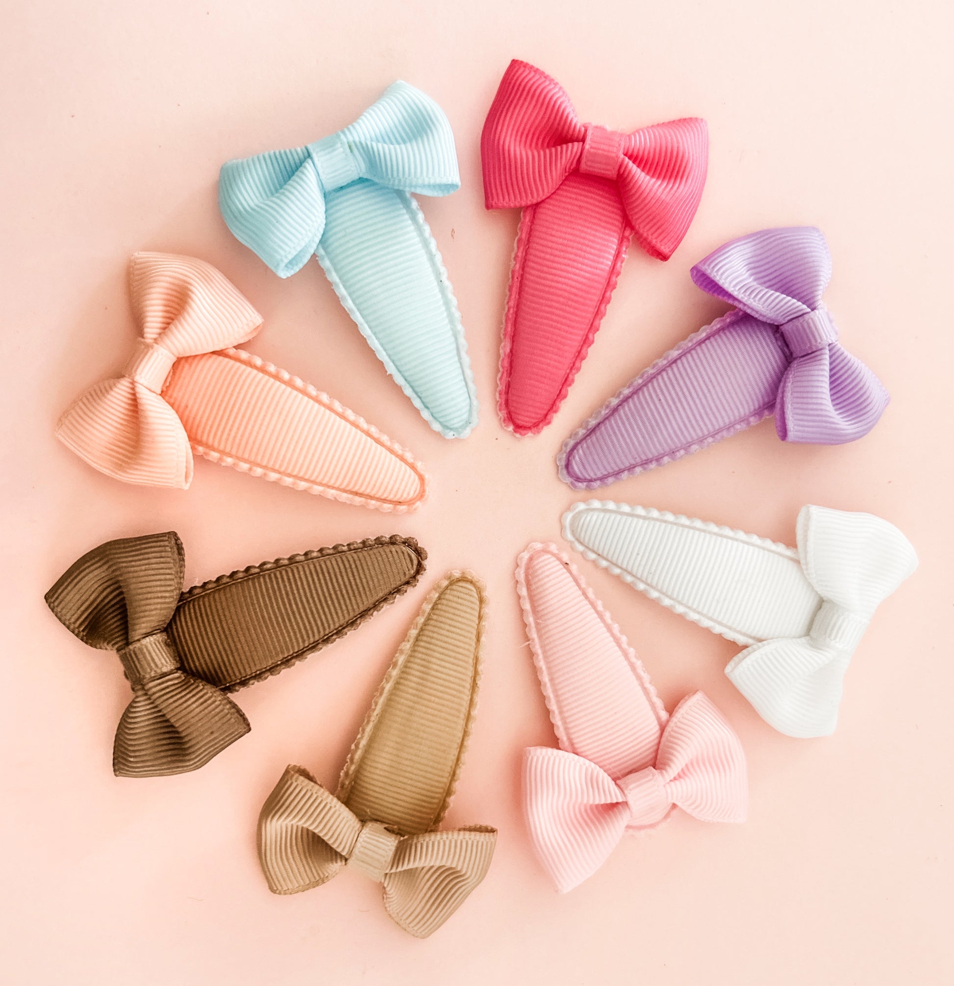 Sweet fabric covered snap hair clips with matching bows in 8 colours!