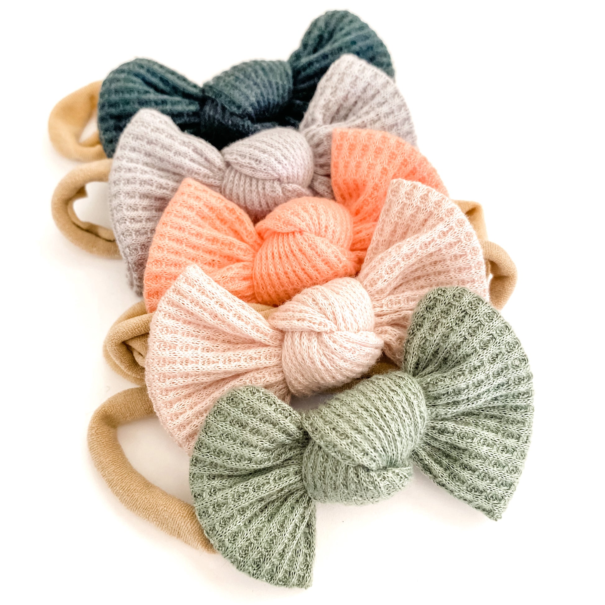 Gorgeous soft knit bows, hand-tied with a centre knot made on a stretch headband perfect for all ages.